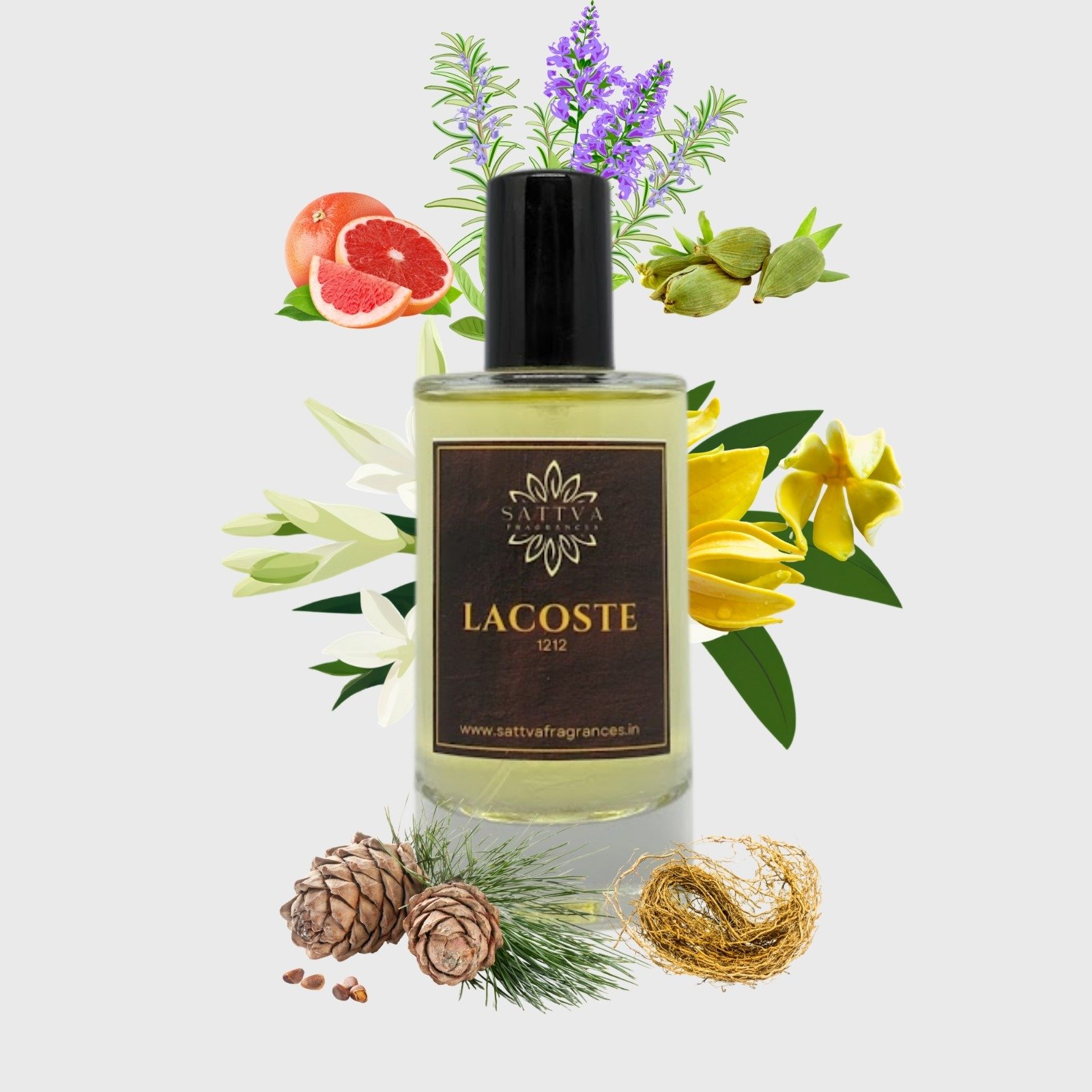 Lacoste 1212 opens with a fresh, spicy burst of grapefruit, rosemary, and cardamom that energizes the senses. It evolves into a floral heart of exotic ylang-ylang and creamy tuberose, settling into a rich, woody base of cedar, soft suede, vetiver, and rugged leather for an addictive, confident trail.
